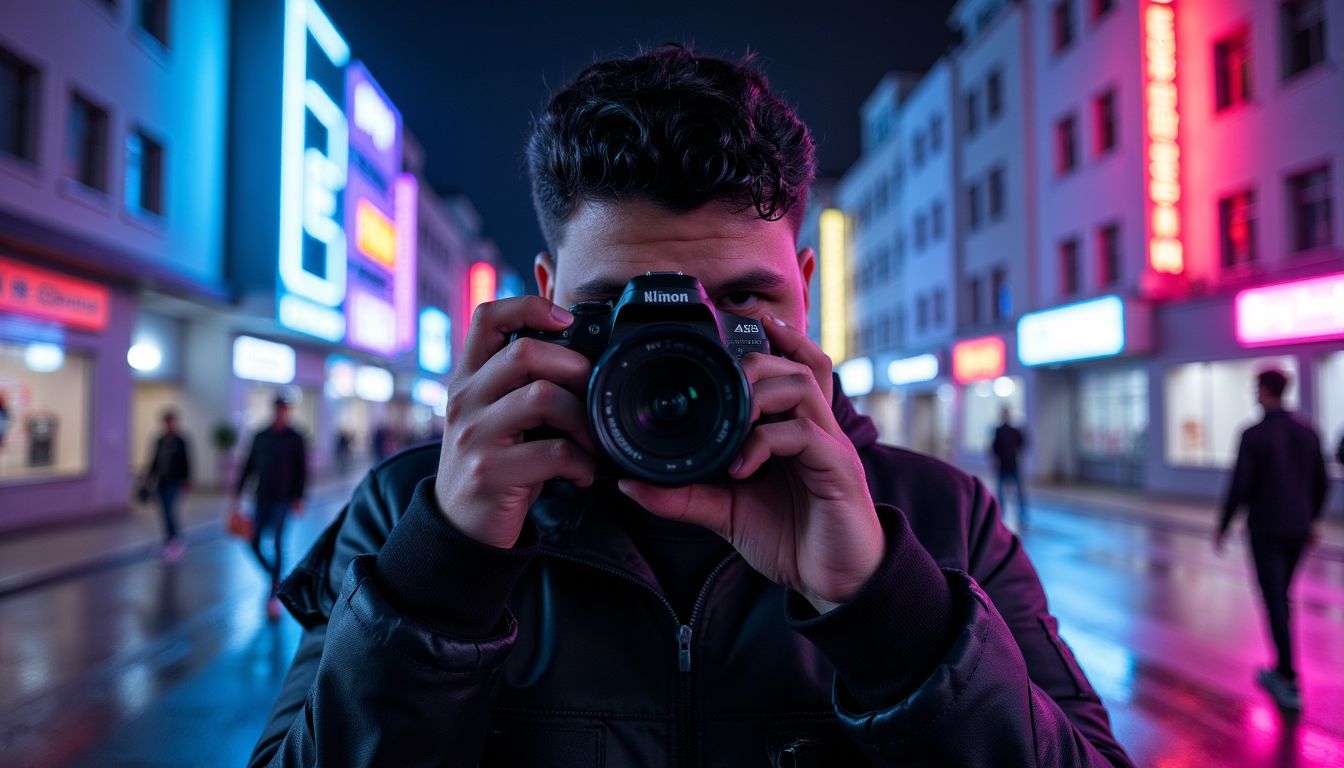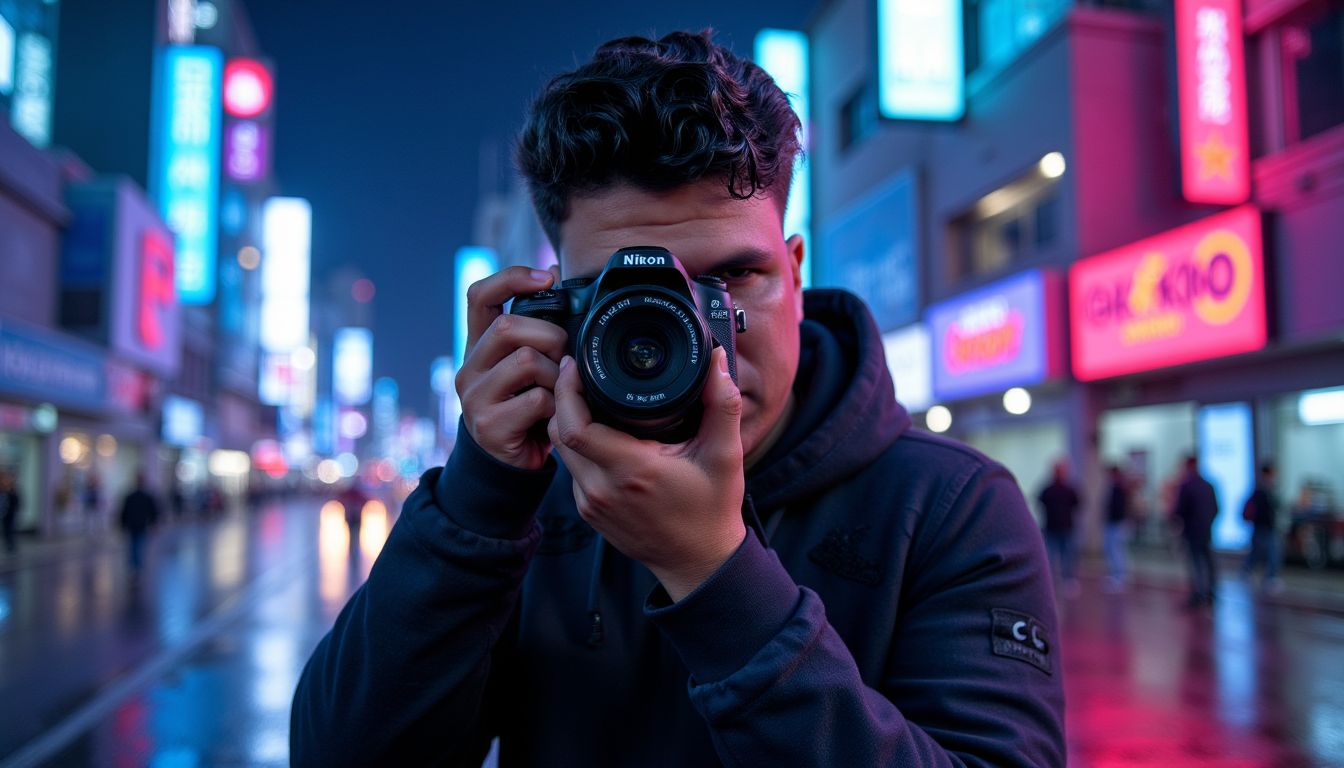 📷 Equipamento Fotográfico: câmera, lente e filme real, simulando fotografia profissional.